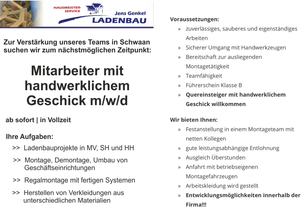 Die Verbindung von konzeptionellem mit praktischem Handeln und das Zusammenwirken von unterschiedlichen Disziplinen und ihre produktive Wechselwirkung bilden eine wichtige Grundlage der eigenen Leistungs- und Zukunftsfähigkeit. Die konsequente Umsetzung dieser Firmenphilosophie mit mehr als 10-jähriger Praxiserfahrung führten dazu, dass die Firma "Jens Genkel Ladenbau" heute ein Leistungsspektrum anbieten kann, das weit über die reine Montage von Ladeneinrichtungen hinausgeht.